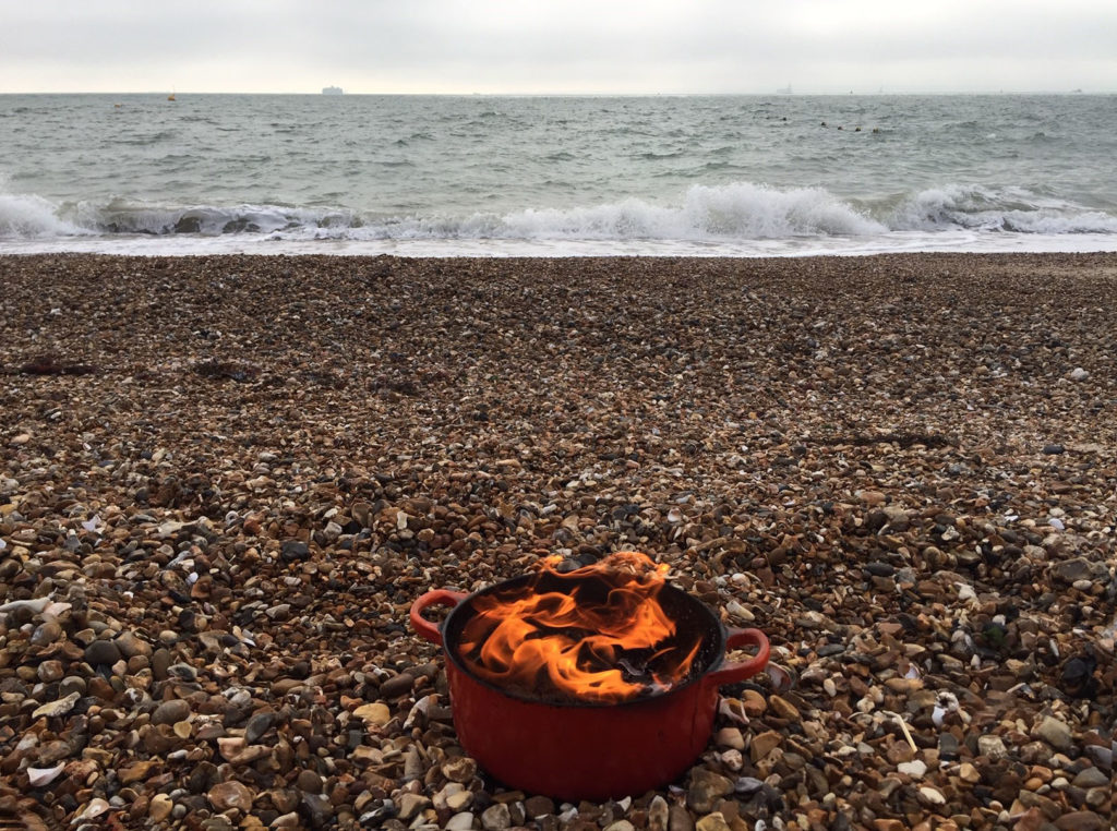 So today, I walk down to the beach with my cast-iron cooking pot full to the brim with the strips of paper marked out as those to burn. I carry with me the voice of my teacher Annabelle saying, “There is gold in the dark”, and my teacher Pauline saying, “Burning ceremonies can be really powerful.” As I arrive, an older woman with long white hair walks down the shingle and starts to undress to go into the sea. She has a beautiful body and a clear sense of purpose. I sit down and arrange my pot among the pebbles, then try to get the matches to light in the blustering November breeze.