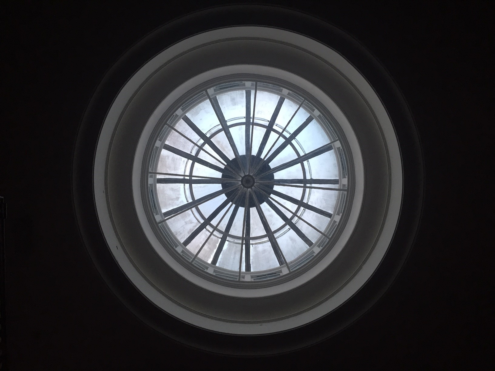 The curved dome has sixteen gores – tapering outer panels reaching up and over, closed like a protective glass bud above the hallway. Below them, at high ceiling height, a flat circle provides a glass floor to the dome, divided into twelve sections. At the centre is a carved rose with eight petals. This is sacred geometry. The numbers beat with each other in musical syncopation.